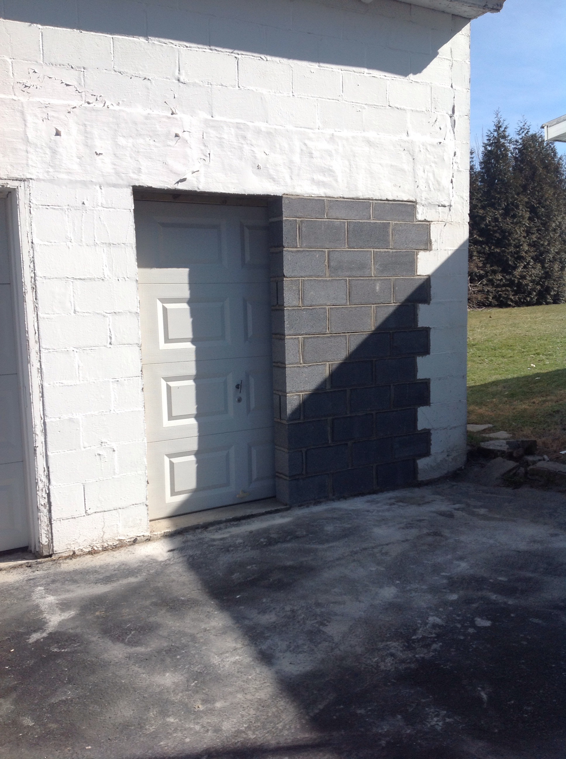 Originally a two-part wooden door opened to the work bench / potting shed of my garage. I like the above view of layered solutions. The craftsmen who integrated the block wall were a delight to watch. Photograph below shows the new door and windows. The mammoth piece of equipment signals that soon water will be piped in and out of the space.